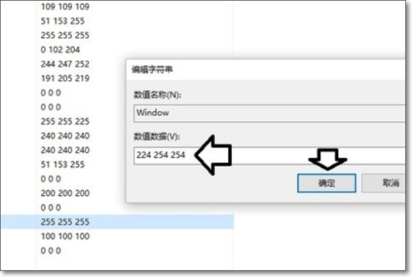 3、然后,将数值数据中原有的(白色)255 255 255修改为(湖绿色):224 254 254(注意数字中间是有一个空格的,否则会出错)→确定。