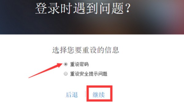 4.进入后就会看到有两个选择,360问答选择“重设密码”并点击继续(如下图):