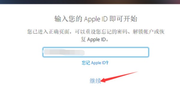 3.“Apple ID”输入完毕过后点击继续(如下图):