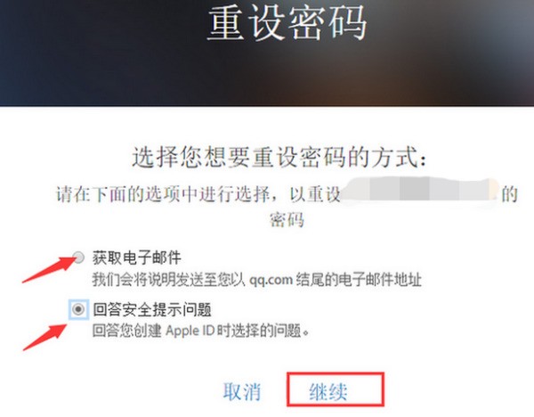 5.进入过后,会看到有两种重设密码的方式,喜欢用哪个方式就点击那个方式,接着点击继续(如下图):
