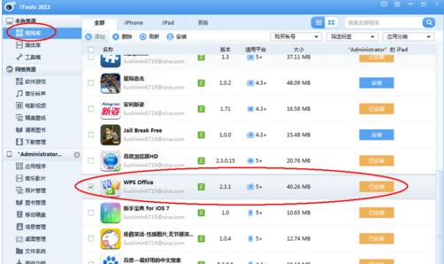 第三步:在itools界面,进入网络资源--软件游戏菜单下,搜索wps office并点击安装按钮,然后等itoos自动下载安装此工具软件。如图: