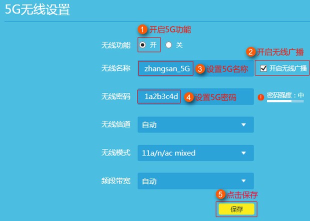 注意:建议您在设置双频无线路由器的无线信号名称时,将2.4G和5G的信号设置为不同的名称,避免使用中出现无法区分的情况。