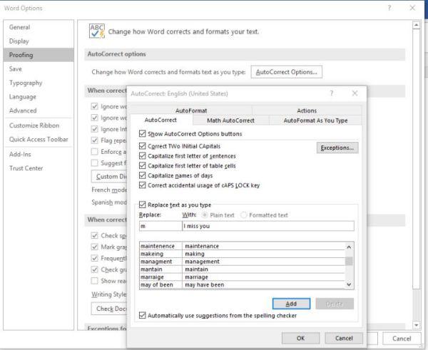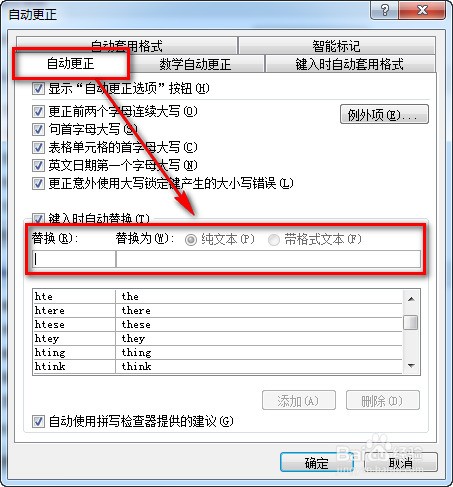 默认显示的是【自动更正选项卡】,可以自定义自动更正的内容。