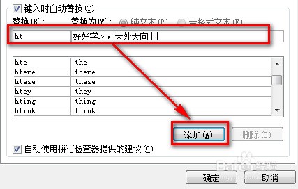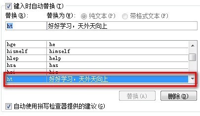 比如说我们要用“ht”来代替“好好学习,天天向上”这个短语。那么在【替换】的位置输入“ht”,在【替换为】中输入“好好学习,天天向上”。