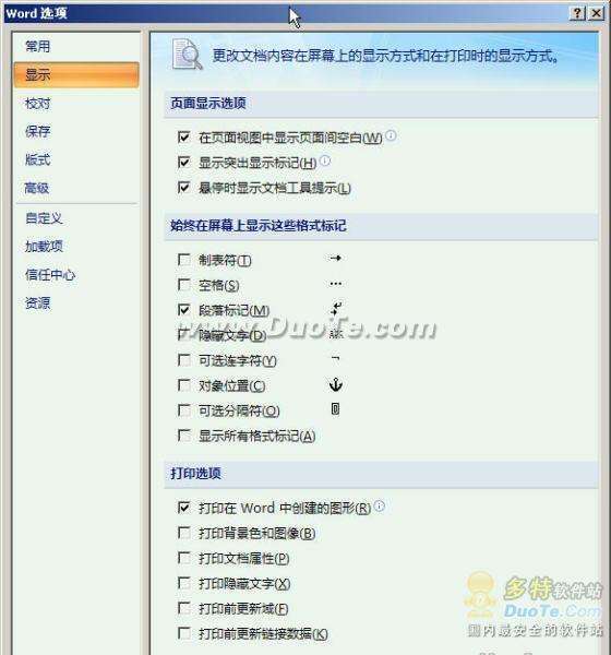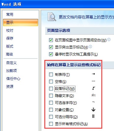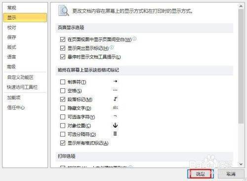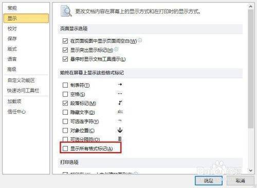 2、弹出Word选项对话框中,选中“显示”,把“始终在屏幕上显示这些格式标记”下边和复选框中的对勾去掉即可,如图所示。
