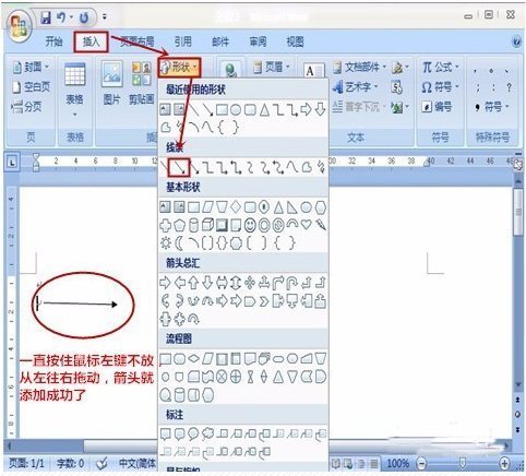 4、点击“续集”里面的箭头符号,用鼠标单击空白地方,会发现鼠标变成了迅仿一个十碧猜字星,按住鼠标左键从左往右拖,松开鼠标之后,一个箭头就形成了。