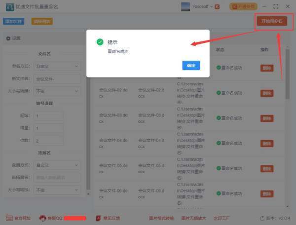 步骤3,当预览的新文件名没有问题的时候,点击右上角“开始重命名”按钮启动软件,当成功修改完文件名称后软件会自动弹出“重命名成功”的提示。