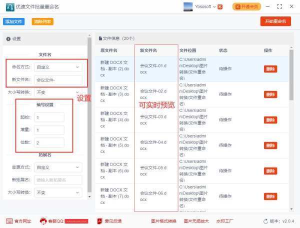 步骤2,添加完文件后就可以进行设来自置了,命名方式选择“自定义”(也可以选择“替换”或“插入”);然后输入新的文件名(也可以不输入);最后进行编号设置:首位是第一个编号,增量是后一位增加的值,位数是几位的意思(001就是3位)。在右边可志编评关氧东永以实时预览新文件名,方便我们查看修改。