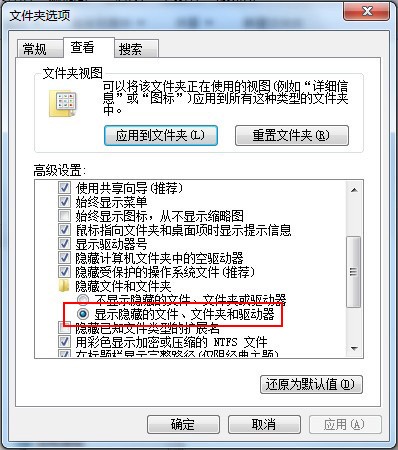 步骤二、打开了“文件夹选项”窗口,切换到“查看”窗口,然后“隐藏文件和文件”选项上点选“显示隐藏的文件、文古容府沉赶案古上贵教件夹和驱动器”选项,如图所示:
