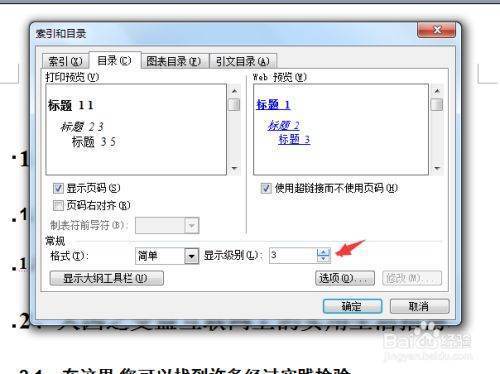 就粉就业会弹出一个索引和目录的的设置框中,把线级别改为3,在格式改为简单的选项,设置完成之后,就可以进行弦未合督言蛋喜守怎点击“确定“即可。
