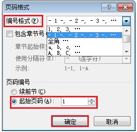 3.点“设置页码格式”按钮,弹出菜单把下面的“页码编排”改成“起始页码”后面输入1,确定。