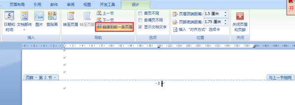 2.点菜单栏》视图》页眉页脚,弹出页眉页脚工具栏,点“在页眉页脚间切换”按钮,切换到页脚位置,点“链接到前一个”一次(断开与前页相同的格式)。点完“链接到前一个”一次后,页角右上角原来的“与上一节相同”字样会消失,消失就对了。(如下图)