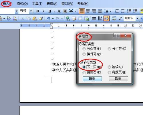 1.把鼠标定位在要插入页码页的第一个字的前面(第4页正文页首),点菜单栏》插入》分隔符,选“下一页”确定。(如下图)