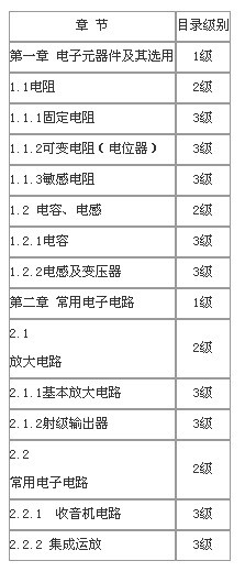例如,设置“第一章 电子元器件及其选用”的级别为“1级”:将鼠标停留在第一章所在行,单击大纲工具栏中的“正文文本”,可以看到有1级至9级(如下图所示),选择为“1级”。接下来,按照同样的操作步骤设置各个章节的目录级别,如下表所示。