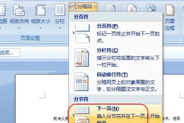 3、在“分节符”中选择“下一页”。