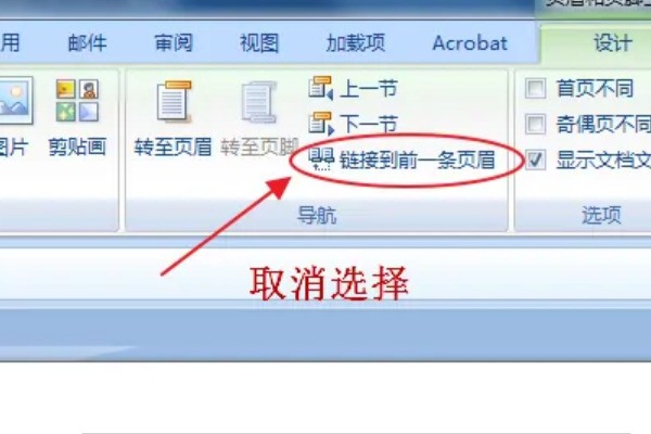 5、取消“链接到前一条页眉”。