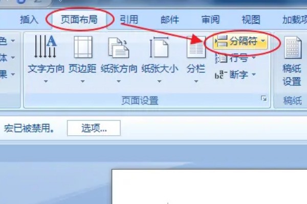 2、鼠标放置到第一页的末尾处,点击“附修论轮才组调季鲜物些页面布局”,选择“分隔符”。