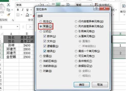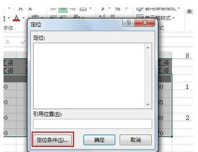 1,构建辅助列,在h3、i4单元格分别输入数字1,然后选中h3:i4区域,双击填充柄,按下f5键,弹出定位框,单击定位条件按钮。