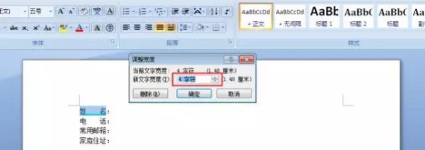 然后在“调整宽度”对话框里设置文字宽度为4个字符,因为咱们要对齐的字符里最长的字符是“家庭住址”,就是4个字符。设置好后,不管是两个字符,三个字符还是四个字符的都是一样整齐了吧,比用空格对齐简单高效多了。