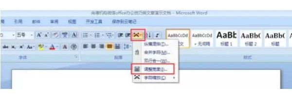 2、同样的步骤选中要对齐的文字,然后在开始选项卡里,段落组中找到这个中文版式里的“调整宽度”按钮。