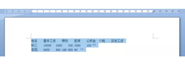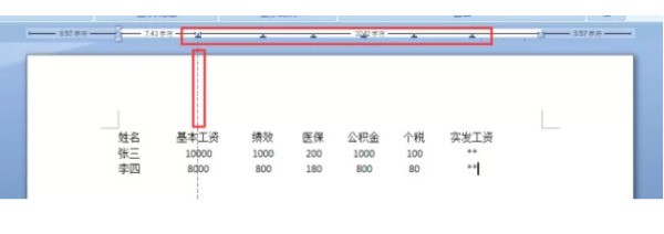 在上面标尺栏用鼠标拖动标尺,会自动生成制表符,松开标尺看该列对齐的效果。同样通过拖拽调节制表位,能迅速调整文字的对齐位置。