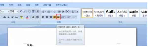 选中要对齐的文字,注意只选中文字不包括冒号,找到“开始”选项卡里,选择段落里的“分散对齐”按钮。
