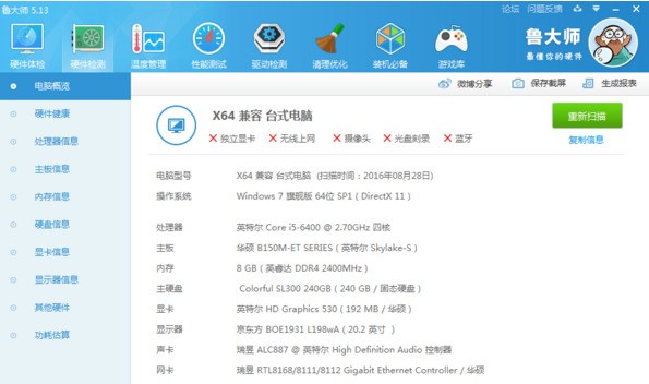 打开鲁大师后,它会自动检测你电脑的硬件信息,包括电脑型号、系统、主板、处理器等信息,你可以核对是否和你购买时的配置一样。