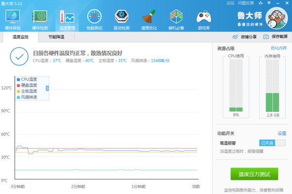 能实时检测CPU、显卡、硬盘温度,温度过高时还会报警,全面节能”可以全面保护硬件,特别适用于笔记本;“智能降温”可对主要部件进行自动控制降温,特别适用于追求性能的台式机。