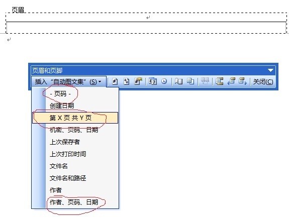 2、选择“页眉“或”页脚”,然后在下面的“插入'自动图文集'”中选择“页码“或|第X页共Y面”或"作者、页码、日期“或|”机密、页码、日期“中的任意一个功能均可。