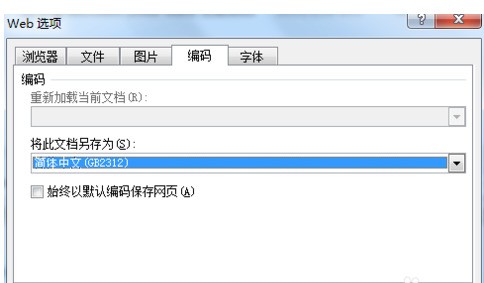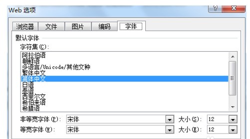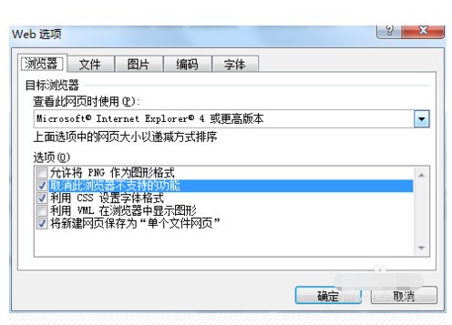 点击工具→Web选项,调出对话框,共有五项功能:浏览器、文件、图片、编码及字体。浏览器选项内你可以选择需要的功能,但是请将“允许将png作为图形格式”勾选,否则png图片不能正常显示在网页上