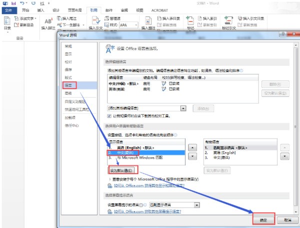 3、找到需要的语言即可,同时,将“自动检测语言”的勾去掉。如果用户的Word变成英文版了,出来的界面都是英文版,看不懂不要紧,可以对着图标来看,就能改回中文版了。