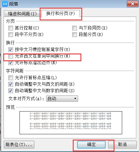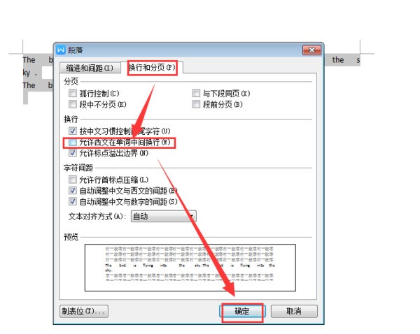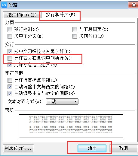3、点击段落后,选择换行和分页。去掉”允许西文在单词中间换行”前面的√。点击“确定”。