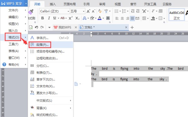2、点击wps图标后面的倒三角形。点击“格式”。选择段落