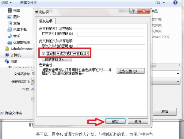 5、然后在“常规选项”的对话框中勾选“建议以只读方式打开文档映氢牛提条物”,再点击“确定”按钮。