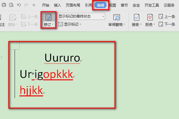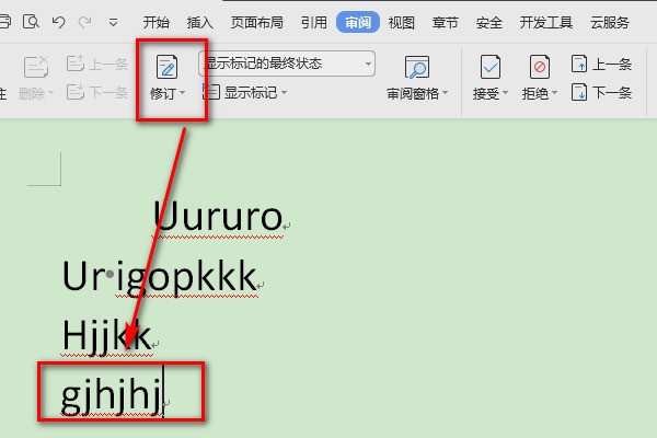 1、新建一个新的word文档,随机输入内容,在上方栏目选择“审阅”-“修订”。