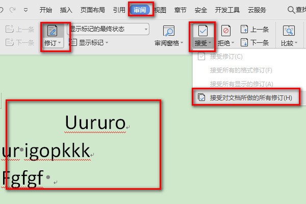 3、选择“响皇属审阅”-“接受”-“接受对文档所做的所有修订(H)”,原修订模式下修改后的标注部分,此时显示为黑色。需要特别注意的是,此时文档仍处于修订模式,非文档正式版,再次输入内容,新增部分仍会突出标注。