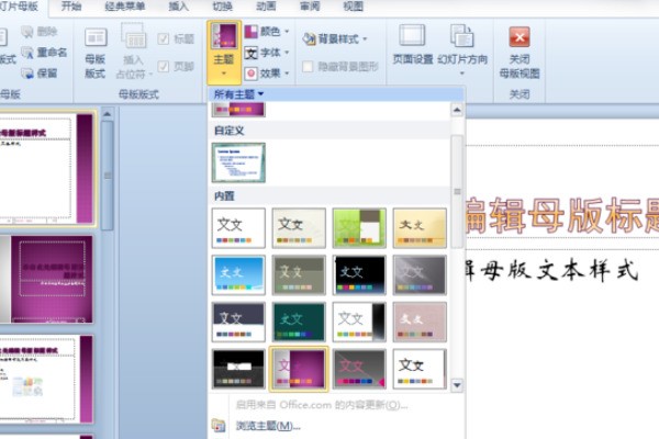 5、单击“编辑主题”组中的“主题”按钮,然后打开所有内置主题样式,右键单击主题样式,并在弹出的下拉列表中选择“应用于选定的幻灯片母版” - 下单。 。