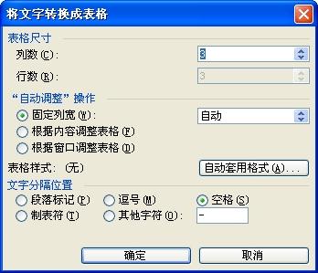 上面对话框中可以选中列数和行数,而文字分隔符位置,是列与列和行与行之间的分隔字符,我用的是空格。