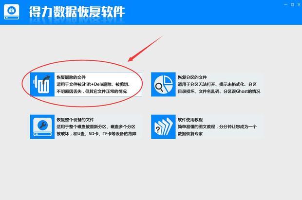 2、打开得力数据恢复软件并选择恢复误删文件功能。