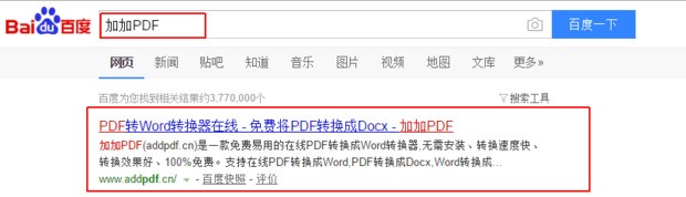 1、直接在百度搜索 加加PDF 或 加加PDF转Word转换器,如下图所示,点击红色方框中的链接。