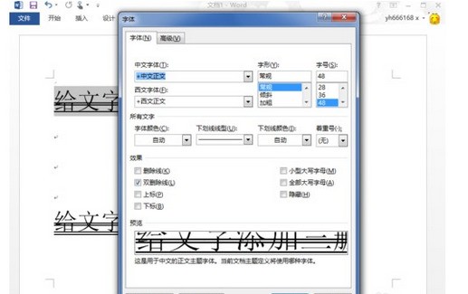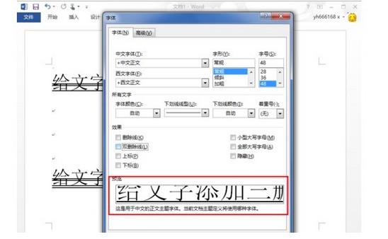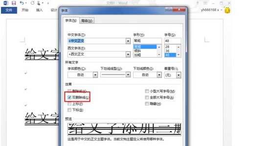 4、去掉“双删除线”的勾选,在下面的预览框这可以看到少了两条删除线。