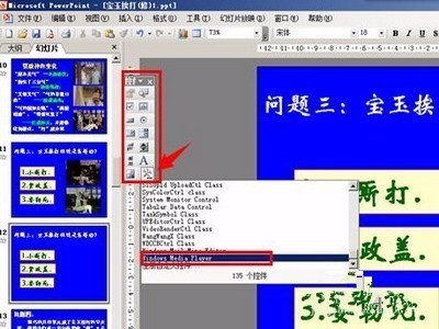 【2】出现了控件工具箱,点击工具箱的右下角的“其它控件”,点下拉箭头往下找,找到“windows media player",单击,这时鼠标就变成了十字号,在幻灯片上划定区域,就出现了视频播放的播放器界面。