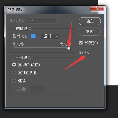 4、点击确定进行导出,然后会弹出一个JPEG选项窗口,在这个窗口中可以进一步都导出的jpg格式图片属性进行设置。