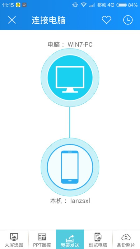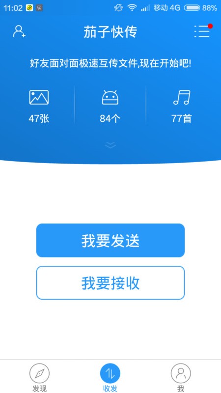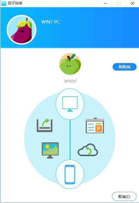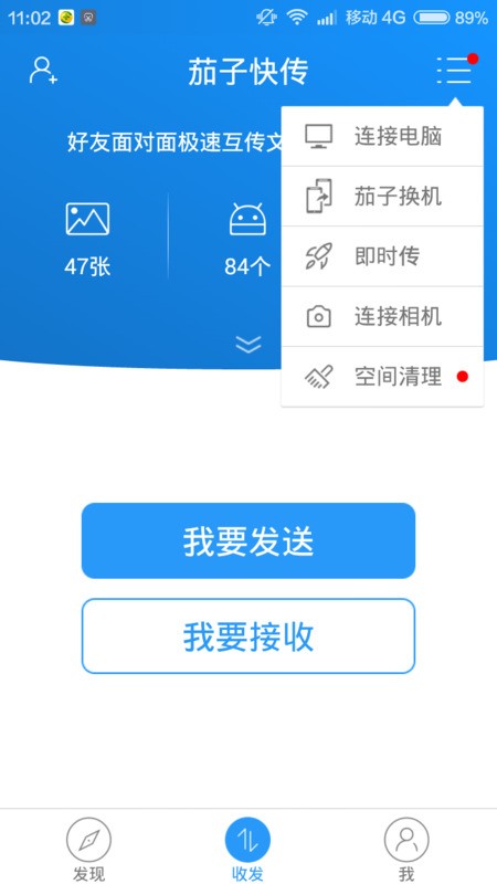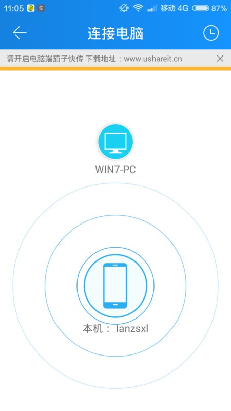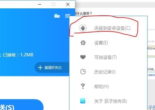 在手机上打开“茄子快传”,点击右上角的菜单键-----连接电脑。