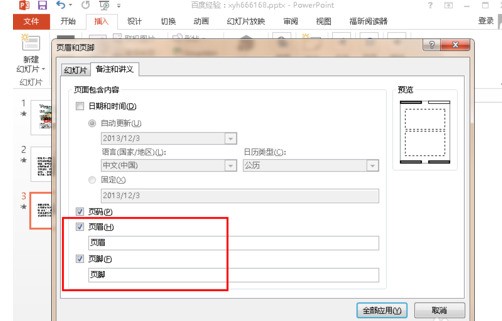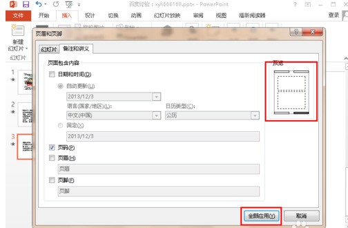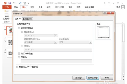 6.在左下方 点击去掉“页眉”和“页脚”前面的勾选,然后点击右下方的“全部应用”按钮,这样就去掉了幻灯片文档中的页眉和页脚了。