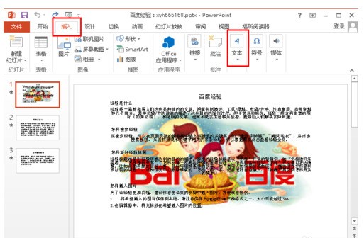 2.点击上方菜单栏中的“插入”,打开插入工具栏,如下图所示,然后在插入工具栏中选择“文本”。