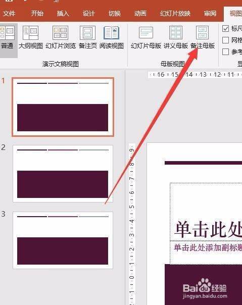 点击视图,主界面上方,会弹出视图选项包含的支持的功能,我们在里面找到备注母版