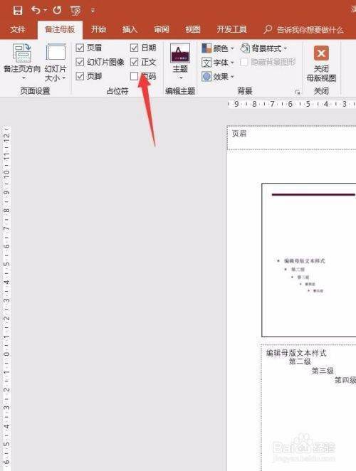 点击备注母版,我们科看到,里面有一个页码的复选框是没有勾选的,计屋继每起今动额品因为没有勾选,就会导致打印的时候没有页码