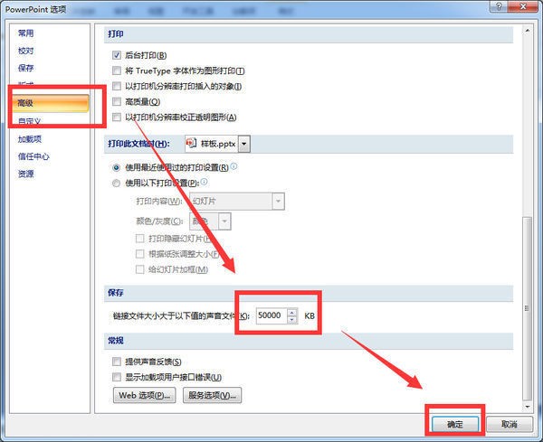 点击“高级”,将页面往下滑,找到“保存”菜单,将声音文件的对应的值,改成50000,再点击确定;