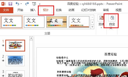 2、点击菜单栏中的“设计”,打开设计工具栏,之后在设计工具栏中选择“自定义”。